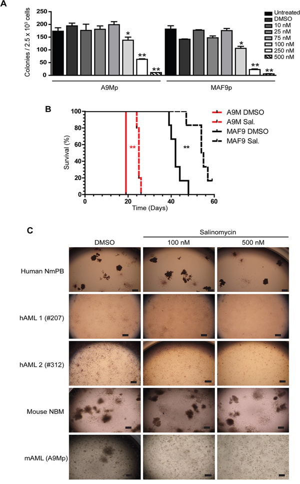 Figure 6: Anti-leukemic effects of salinomycin in primary cells. A. Bar graphs showing decreased myeloid colony formation in untreated A9Mp and MAF9p primary mouse leukemia cells or following salinomycin treatment at the indicated dosage or 0.01% DMSO vehicle control. B. Kaplan Meier plots demonstrate extended survival in recipient mice (n=5 per group) following transplantation of salinomycin treated A9Mp or MAF9p primary leukemia cells compared to untreated or 0.01% DMSO vehicle controls. P-values, Log-rank (Mantel-Cox) Test. C. Representative images of colony formation of human normal mobilized peripheral blood (NmPB), patient samples hAML-1(#207), hAML-2 (#312), mouse normal bone marrow (NBM) and mouse AML (A9Mp) following salinomycin treatment at the indicated dosage or 0.01% DMSO vehicle control. Colonies were stained with 1 mg/ml p-iodonitrotetrazolium violet for 16 hours and images captured at x2 using an inverted microscope. Scale bar = 4 μm.