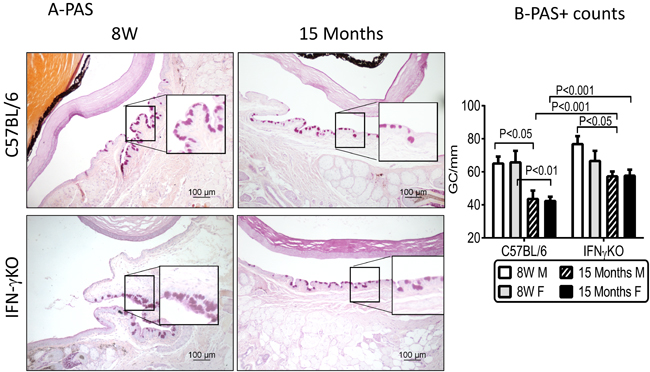 IL-13 is a cytokine that promotes goblet cell homeostasis [40, 41]. IL-13 mRNA transcript levels were higher in female 8W B6 and male 15M B6 (P < 0.0001, Figure 2E), and at the same time were significantly higher in IFN-γKO female mice, in both young and aged groups (P < 0.0001). IL-13/IFN-γ mRNA ratio was decreased in aged male B6, while IFN-γKO mice had unchecked IL-17 and IL-13 (Figure 2F and not shown).