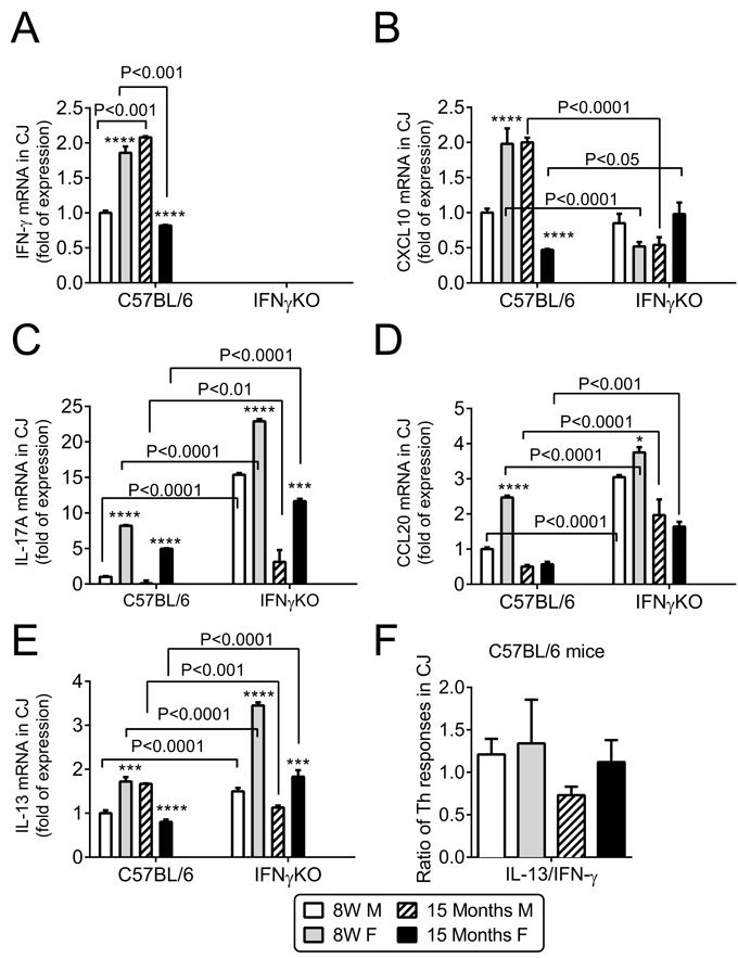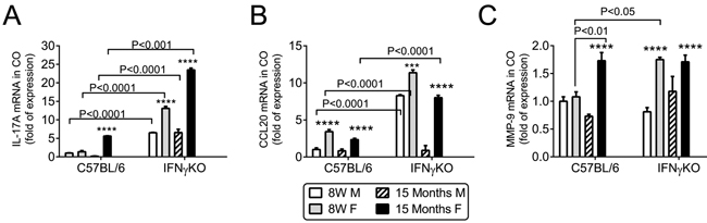 We found that levels of IFN-γ mRNA transcript were significantly higher in female B6 mice at 8W (P < 0.001) and in male B6 at 15M (P < 0.001, Figure 2A), but they were completely absent in the IFN-γKO mice. The mRNA transcripts of CXCL10, a chemokine involved in trafficking of Th-1 cells [37], were significantly elevated in the young female B6 mice and aged male B6 mice (P < 0.0001, Figure 2B) and were higher in B6 than IFN-γKO in young female and aged male.