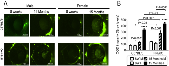 Figure 3: Corneal barrier function in C57BL/6 and IFN-γKO mice of both sexes at 8 weeks and 15 months of age. A. Representative digital images of Oregon Green dextran (OGD) corneal staining that were used to generate the bar graphs in B. B. Corneal Oregon Green dextran (OGD) fluorescence intensity score (mean±SEM, n = 15 animals). W = weeks; M = male; F = female; * P < 0.05; ** P < 0.01; *** P < 0.001; **** P < 0.0001; sex comparison at same age.