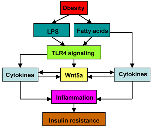 Figure 3 The involvement of macrophage-derived Wnt5a in adipose inflammation and insulin resistance. Wnt5a acts as an “amplifier” in adipose tissue inflammation.