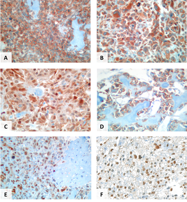 Figure 1: immunostaining patterns with YAP/TAZ and β1-integrin in primary or metastatic conventional osteosarcomas. β1-integrin cytoplasmic and membranous staining a., β1-integrin cytoplasmic staining b., YAP/TAZ nuclear and cytoplasmic staining c., YAP/TAZ cytoplasmic staining d., YAP/TAZ nuclear staining e., YAP/TAZ nuclear expression in metastases of conventional osteosarcomas f.