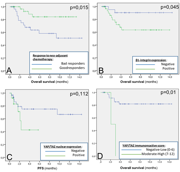 In univariate analysis (Table 4), response to chemotherapy had a prognostic value for both PFS (p = 0.027) and OS (p = 0.015). Two classes YAP/TAZ IRS was correlated with OS (p = 0.01). Nuclear location of YAP/TAZ was not statistically correlated with OS but there was a trend to significance with PFS (p = 0.112). Membranous expression of β1-integrin was correlated with poor OS (p = 0.045).