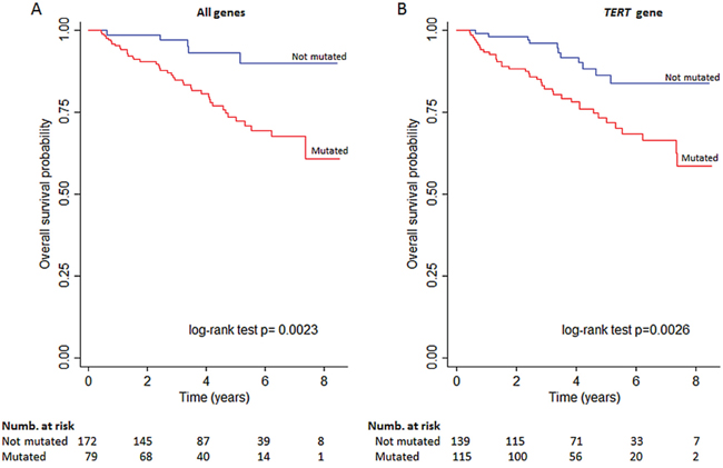 Follow-up time was considered time from diagnosis to death or loss of follow-up, depending on which came first. In the OS analysis all deaths were considered as events; in the cancer survival analysis, the events were only deaths of cancer. Kaplan-Meier plots were used to estimate the probability of overall and cancer survival according to the mutational status at diagnosis (log-rank test was performed to compare the curves).