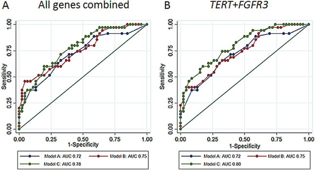 Figure 3: A. AUC for a set of BC risk factors (age, smoking status, and risk of recurrence, model A) and the same set of factors and mutational status of all genes at diagnosis (model B), and at diagnosis plus follow-up (model C). B. AUC for the same models but considering the mutational status of TERT and FGFR3 genes only.