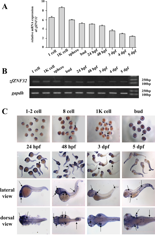 Figure 1: ZfZNF32 expression pattern during early embryonic development. A. ZfZNF32 mRNA was distributed uniformly from the zygote stage to the larval stage according to Q-PCR. B. Agarose gel electrophoresis of the (A) PCR product. C. Whole-mount in situ hybridization revealed the dynamic expression of zfZNF32 during zebrafish development (from the 1 cell stage to 5 dpf), and zfZNF32 was mainly restricted to the nervous system and pectoral fin (lateral view and dorsal view), as indicated by arrows.
