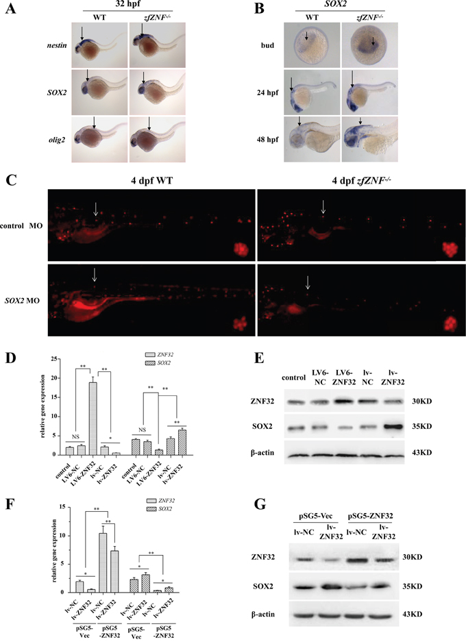 Figure 3: ZNF32 negatively regulates SOX2 expression in vivo and in vitro. A. The early nerve stem cell factors nestin, SOX2 and olig2 were detected by WISH at 32 hpf in zfZNF-/- and WT. mRNA expression is indicated by arrows. B. WISH revealed SOX2 expression in zfZNF-/- and WT at bud, 24 hpf and 48 hpf stages. SOX2 mRNA expression is indicated by arrows. C. The regenerative capacity of the lateral line system was decreased in 4 dpf zfZNF-/- microinjected with SOX2 MO compared with control MO at 24 hrs after neomycin treatment. Hair cells in the lateral line were stained with DASPEI (red fluorescence). The L1 was chosen as the representative regenerating neuromast, as indicated by arrows, and shown in the lower right corner of each figure with 200×magnification. Relative gene expression of ZNF32 and SOX2 in BE(2)-C cell lines was detected at the mRNA level by Q-PCR D. and at the protein level by western blotting E. Untreated BE(2)-C cells served as controls. BE(2)-C lv-NC and BE(2)-C lv-ZNF32 cells were transiently transfected with pSG5-Vec and pSG5-ZNF32. Q-PCR and western blotting were performed to detect the relative expression of ZNF32 and SOX2 at the mRNA F. and protein level G. All of the quantitative values are presented as the means±S.D. *P< 0.05, **P< 0.01. NS, not significant.