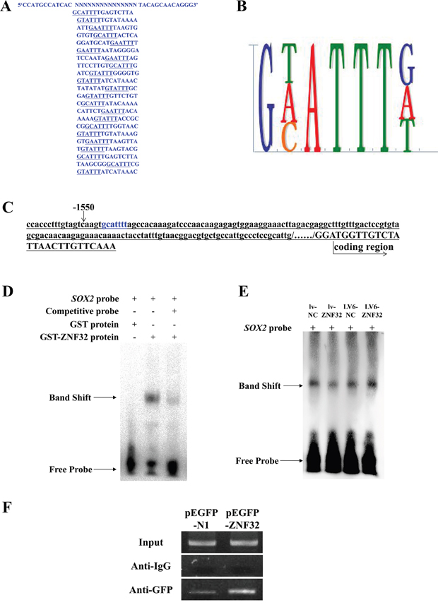 Figure 4: ZNF32 directly binds the SOX2 promoter to suppress SOX2 transcription. A. The DNA binding sites were identified by CASTing. The DNA sequences of the 22 clones are shown. B. Analyses of the sequences of the 22 clones revealed the ZNF32-DNA binding site as 5’- g(a/c/t)attt -3’. C. The 2-kb region upstream of the human SOX2 promoter was from the NCBI web server. Blue characters mark the DNA binding site, 5’- gcattt -3’, located at -1545. D. EMSA revealed that the SOX2 probe was preferentially bound by the ZNF32 protein compared with GST, and the binding capacity was weakened as competitive probe was added in vitro. The band shift revealed the protein-DNA binding capacity. E. EMSA showing that protein-probe binding corresponded to nuclear ZNF32 protein expression. Nuclear proteins were isolated from the BE(2)-C stable cell lines lv-NC (lane 1), lv-ZNF32 (lane 2), LV6-NC (lane 3), LV6-ZNF32 (lane 4). The band shift changed with the ZNF32 expression level. F. GFP-ChIP PCR results indicated that ZNF32 over-expression increased the protein-DNA binding ability, suggesting that ZNF32 specifically binds the SOX2 promoter sequence. IgG was used as a negative control.