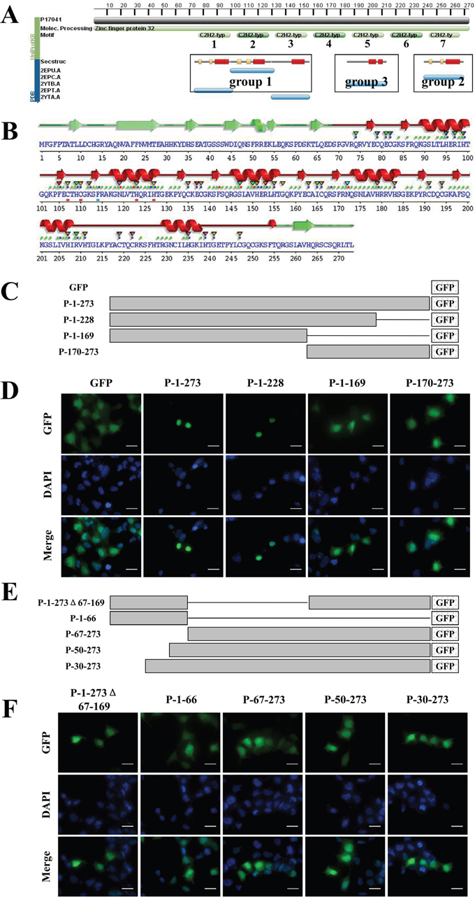 As described above, we demonstrated that ZNF32 inhibited SOX2 transcription. The NLS of ZNF32 is critical for the nuclear translocation and function of ZNF32. Bioinformatics analyses from the PDB and the EMBL-EBI protein data bank identified the zinc-finger motifs, secondary and tertiary structure of ZNF32 (Figure 5A). Several α-helixes and β-sheets are distributed in ZNF32 (Figure 5B). We also analyzed the protein sequence of ZNF32 and found no consensus NLS sequences based on similarity to the classical SV40 and bipartite NLS sequences. Thus, to identify the NLS of ZNF32, a series of mutants were constructed according to the secondary and tertiary structure, as shown in Figure 5C. Fusion proteins P-1-273 (full-length ZNF32), P-1-228 (Aa 1-228) are nuclear localized, whereas fusion proteins P-1-169 and P-170-273 displayed increased accumulation of fluorescence in the cytoplasm, suggesting that the ZNF32 NLS may be located between amino acids 170-228 (Figure 5D). However, the NLS of ZNF32 alone was not sufficient for the nuclear location, as P-170-273 was distributed throughout the cell. To further examine whether sequence 1-169 containing group 1 (Aa 67-169) was essential for the nuclear location of ZNF32, we constructed several ZNF32 deletion mutants (Figures 5E). Protein P-1-273Δ67-169 (Aa 67-169 deleted) was present throughout the whole cell, indicating that group 1 is indispensable for ZNF32 nuclear localization. Moreover, fusion proteins P-1-66, P-67-273, P-50-273 and P-30-273 showed significant cytoplasmic localization (Figure 5F). Our data demonstrate that the entire Aa 1-169 region is essential for ZNF32 nuclear localization.