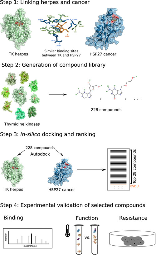 Figure 1: Computational drug repositioning pipeline to predict HSP27 binders. Step 1: viral thymidine kinase and HSP27 share a binding site. Step 2: The potency of 228 thymidine kinase ligands to bind HSP27 is assessed with docking. Step 3: 29 of these ligands bind in silico better than the known binder BVDU. Step 4: Experimental validation of six ligands.