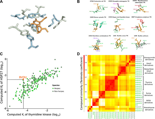 Figure 2: VTK and HSP27. (A) Viral thymidine kinase (green) and HSP27 (blue) share a similar binding site with five residues of very similar conformation. BVDU (orange) binds both VTK and HSP27. (B) Eight non-viral thymidine kinases (grouped around the central viral thymidine kinase) share a similar binding site to VTK. Overall, there are 228 ligands binding the viral and the non-viral TKs. (C) In silico docking of these 228 ligands against VTK and HSP27. The docking scores correlate (0.84, p-value < 10−16). 29 ligands have higher computed affinities than the known binder BVDU. (D) One of the 29 ligands is closely related to BVDU, but the vast majority is chemically dissimilar.