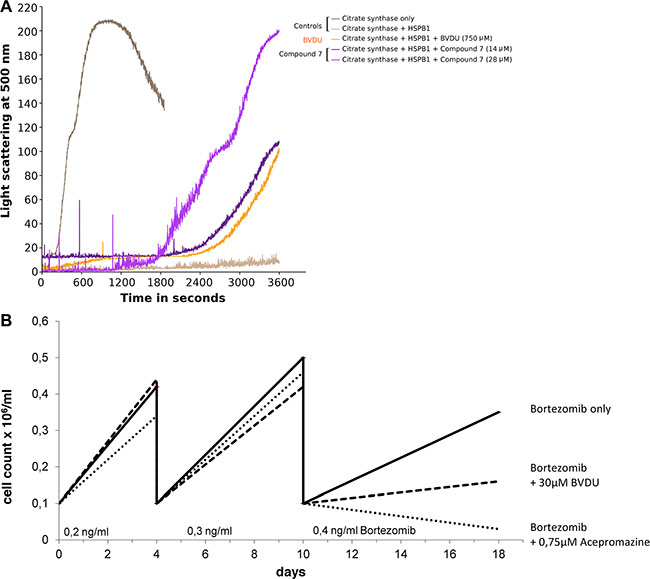 Figure 3: (A) HSP27 acts as chaperone for CS (citrate synthase + HSP27); compound 7 (14 and 28 μM) and BVDU (750 μM) inhibit HSP27 chaperone function. (B) Suppression of drug resistance versus Bortezomib was measured by comparing live cell counts over three passages comparing BVDU, a lead compound, and a control.
