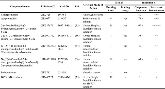 To validate the six compounds we subjected them to three different tests: First, we checked for binding to HSP27. Second, we investigated the impact of binding on HSP27’s function as chaperone. Third and most important, we tested whether and how strongly the compounds reduce resistance development in cancer cell lines. The results of these three experiments are summarized in Table 1 and discussed in detail below.