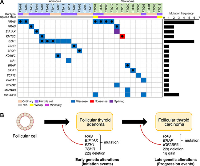 Figure 3: Driver mutations and pathway analyses. (A) 16 genes with 31 nonsilent mutations are shown. On the right, the numbers of non-silent mutations are shown for each gene. Black filled circles represent the reported variants in the COSMIC database. (B) Schematic representation of early and late genetic alterations in thyroid follicular tumor. Development of FTA requires early genetic alteration (initiation events) such as RAS and EZH1 mutations. Additional genetic alterations (progression events) such as RAS and BRAF mutations and copy loss on chromosome 22q may contribute to progression of FTA to FTC.