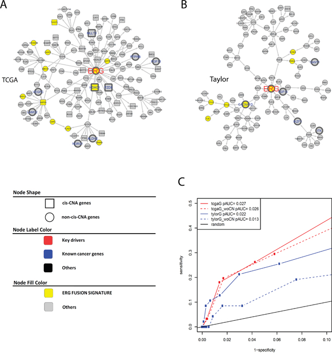 Figure 2: A and B. ERG subnetworks extracted from TCGA IMBN (A) and Taylor IMBN (B). Nodes of yellow color represent previously identified ERG fusion signature genes. Genes known to be cancer related are labeled in larger font size with blue color (nodes with thicker boarder). Square nodes represent genes regulated by cis CNA. C. The accuracy of ERG subnetworks is assessed using previously identified ERG fusion signature genes.