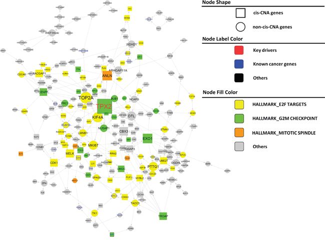 Figure 3: Subnetworks positively associated with BCR in PCa. Nodes of varied colors represent different pathways enriched in the subnetwork. Genes known to be cancer related are labeled in larger font size with blue color (nodes with thicker boarder). Key driver genes are labeled in larger front size with red color. Square nodes represent genes regulated by cis CNA. Edges directly associated with key drivers and NLGN4Y are colored blue and red, respectively.