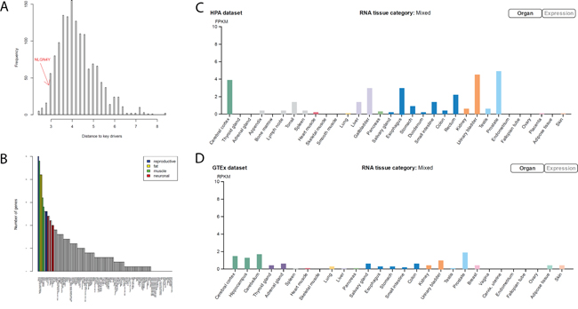 Figure 5: NLGN4Y as a common downstream gene (mediator) of the 5 key drivers in the negative BCR network. A. The distribution of the average shortest distance to the 5 key drivers. NLGN4Y is among the top 10% of genes closest to the 5 key drivers, noted as common downstream genes of the 5 key drivers. B. The number of common downstream genes preferentially expressed in each tissue, suggesting that common downstream genes are preferentially expressed in reproductive, muscle, fat, and neuron related tissues. C and D. NLGN4Y, which is expressed highest in prostate tissue, is preferentially expressed in neuron-related tissues according to the HPA dataset (C) and the GTEX dataset (D).