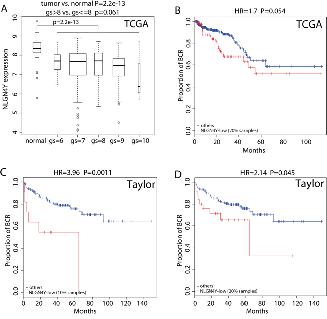 NLGN4Y expression is significantly lower in tumor tissues compared to the normal tissues in the TCGA dataset (Figure 6A, p-value=2×10-13). NLGN4Y expression is also lower in high grade tumors (Gleason score >8) compared to lower grade disease (Gleason score <=8) with borderline significance (Figure 6A, p-value=0.061). Compared with NLGN4Y expression in the normal tissues, 20.0% tumor samples in the TCGA set expressed significantly lower level of NLGN4Y (p<0.01 under the normal distribution with mean and standard deviation estimated from the normal tissues). The NLGN4Y-low group was associated with higher risk for BCR in the TCGA set (Figure 6B, HR=1.7 and p=0.054). Since the Taylor dataset doesn’t consist of any normal samples, we used the distribution of NLGN4Y expression in the TCGA data set as a reference for categorizing its expression in the Taylor data set. Given the Taylor data containing more patients of lower disease grade than those in the TCGA dataset, we assume the percentage of NLGN4Y-low patients is less than 20%, the percentage in the TCGA dataset. Figure 6C and 6D show the survival curves when the percentage cutoff is set to be 10% and 20%. In both cases, the NLGN4Y-low group was associated with significantly higher risk for BCR (HR=3.96 and 2.14, p=0.0011 and 0.045, respectively).