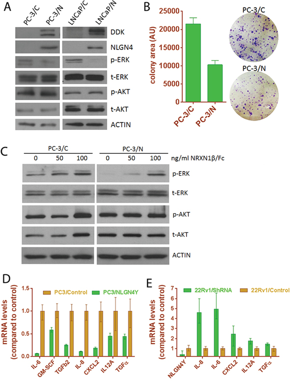 Figure 7: Expression of NLGN4Y decreases cell proliferation and pro-inflammatory cytokine expression. A. NLGN4Y expression decreased ERK phosphorylation in PC-3 and LNCaP cells. B. NLGN4Y expression decreased colony formation of PC-3 cells. C. Treatment of PC-3 cells with decoy receptor NRXN1β/Fc for 1 hour abolished the effect of NLGN4Y expression on ERK phosphorylation. D. NLGN4Y expression downregulated pro-inflammatory cytokine expression in PC-3 cells. E. NLGN4Y shRNA upregulated these cytokine expression in 22Rv1 cells.