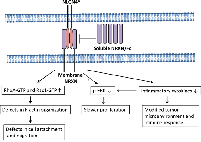 Figure 9: A model to illustrate NLGN4Y signaling in prostate cancer cells. NLGN4Y binds to membrane-bound NRXNs to regulated small Rho-GTPase activities, inflammatory cytokine expression and ERK phosphorylation. Soluble NRXN/Fc blocks to the binding of NLGN4Y to membrane NRXN, thus inhibiting NLGN4Y signaling. Currently, it is not known if NLGN4Y downregulates ERK phosphorylation directly and/or indirectly through controlling inflammatory cytokine expression (eg. IL-6 and IL-8). NLGN4Y expression elevates RhoA-GTPase and Rac1-GTPase activities, which cause abnormal in F-actin organization and subsequently decrease cell migration.