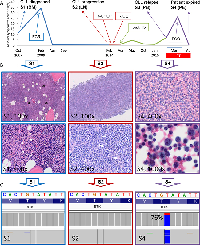 The patient is a 57 year old woman who presented with constitutional symptoms in October 2007 (See Figure 1A for summary of her clinical history and treatment history). A complete blood count showed mild lymphocytosis (White blood cell 15 K/uL with 75% lymphocytes) with typical immuno-phenotypic features of CLL (cytogenetics/FISH not available). Bone marrow biopsy at this time showed hypercellular marrow extensively involved by CLL cells (66%) with proliferation centers (black stars, Figure 1B, top left). High magnification revealed occasional scattered prolymphocytes (white arrows, Figure 1B, bottom left). Following an 18-month observation period, she developed worsening fatigue and cytopenias (platelets 84 K/uL; marrow with 95% CLL cells) and proceeded to receive six cycles of FCR (fludarabine, cyclophosphamide and rituximab). She achieved a complete remission in September 2009. However, the disease returned in January 2014 with manifestations of abdominal discomfort and new pelvic lymphadenopathy. A core biopsy showed that the lymph node architecture is effaced by a diffuse proliferation of small CLL cells (Figure 1B, top middle). High magnification shows an increase in large atypical lymphoid cells and mitotic figures (white arrowheads) which are not associated with proliferation centers, a finding worrisome for CLL with histologic progression [S2] [16] (Figure 1B, bottom middle). Bone marrow aspirate demonstrated 17p deletion by FISH in 8% of cells. She was then treated with two chemoimmuno-regimens, but failed to improve (Figure 1A). She was not deemed a candidate for allogeneic stem cell transplantation due to persistent disease/cytopenias. Thus, ibr monotherapy was initiated in April 2014. The patient had a remarkable partial response that lasted 10 months. However, in February 2015 there was evidence of progressive disease with both worsening lymphadenopathy and lymphocytosis (91%) [S3, PB]. This prompted a change to fludarabine, cyclophosphamide and obinutuzumab regimen (FCO) in March 2015. Within a week, the patient developed a large pleural effusion. Cell block revealed sheets of transformed large lymphoid cells representing ~40% of the total cellularity [S4] (Figure 1B top right). Higher magnification shows highly atypical cells with frequent mitotic figures consistent with RT to large B-cell lymphoma (Figure 1B bottom right). Shortly thereafter, the patient developed fever with altered mental status and subsequently expired in April 2015. Longitudinally, four samples had been collected from the patient: S1, bone marrow collected at initial diagnosis (Oct 2007); S2, lymph node core biopsy at CLL progression (Feb 2014, prior to ibr Rx); S3, peripheral blood following ibr failure (early March 2015); and S4, cell block of pleural fluid with 40% large cells (late March 2015 prior to death).