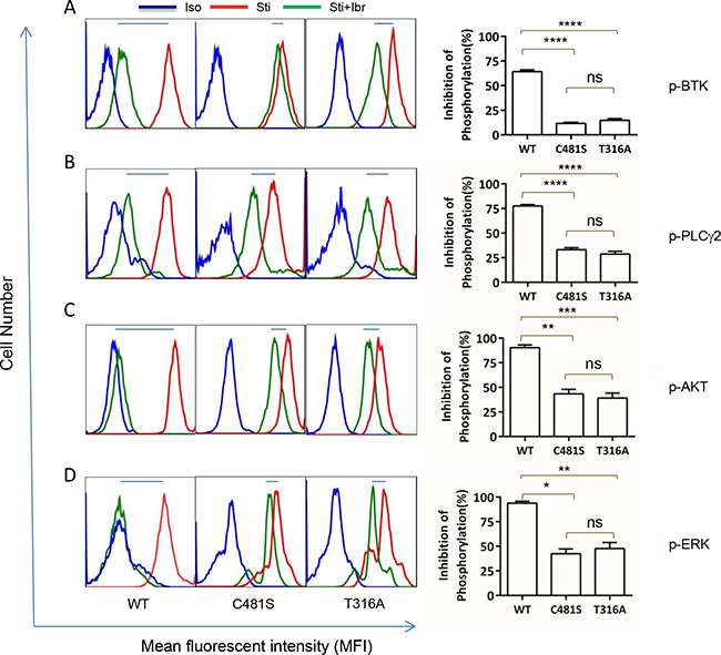 Figure 4: T316A mutation functionally confers ibr resistance at the molecular level. Intracellular protein phosphorylation was measured at day 4 after TMD8 transfection. Iso, isotype control. Sti, Cells were stimulated with anti-IgG/IgM antibodies for 10 min before analysis. Sti+Ibr, Cells were treated with 100 nM ibr for 1 hour before stimulation with anti-IgG/IgM antibodies for 10 minutes. Left panels, representative analyses. Right panel, aggregate data for three repeat analyses. Inhibition of phosphorylaton (%) is calculated as (FSti-FSti+Ibr)/ (FSti-Fiso)x100%, where F denotes mean fluorescent intensity of 10,000 events. Data were analyzed using one-way ANOVA test and graphed with prism 5 GraphPad. A. p-BTK (Y223), B. p-PLCγ2 (Y759), C. p-AKT (S473), and D. p-ERK (T202/Y204).