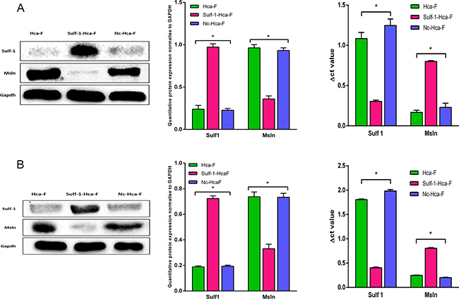 Figure 1: Western blot and qRT-PCR analysis for Sulf-1 and Msln in vitro and in vivo. A. Western blot analysis for Sulf-1 and Msln relative expression in vitro at the protein and mRNA levels. B. Western blot analysis for Sulf-1 and Msln relative expression in in vivo at the protein and mRNA. Statistical significance was observed in Sulf-1-Hca-F group both in protein and mRNA levels. Data are presented in columns as mean ± standard deviation (SD) and the results were statistically significant at *P< 0.05.