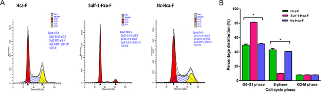 Figure 3: Cell cycle analysis. A. Cell cycle analysis of Hca-F cells; Sulf-1- Hca-F cells; and Nc- Hca-F cells. Cells were synchronized by growth in 100% confluence with reduced serum for three days after which it was cultured in complete medium for 24hr and were then harvested, washed with PBS, stained with PI and analyzed by flow cytometry. The values represent the number of cells in each phase of the cell cycle as a percentage of the total cells. B. Cluster bar chart of the cell cycle showing percentage distributions of the cell cycle phases in the three cell groups. The values were statistically significant at *P< 0.05.