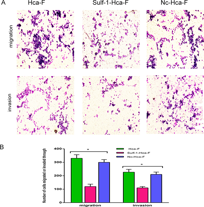 Figure 4: Migration and invasion assay. A. Transwell migration and invasion assays were performed in Hca-F, Sulf-1-Hca-F and Nc-Hca-F cells. The results show a decrease in both migration and invasion in Sulf-1-Hca-F cells. B. Average number of migrating and invading cells presented as a bar chart with mean ± standard deviation (SD). The results were statistically significant at *P< 0.05.