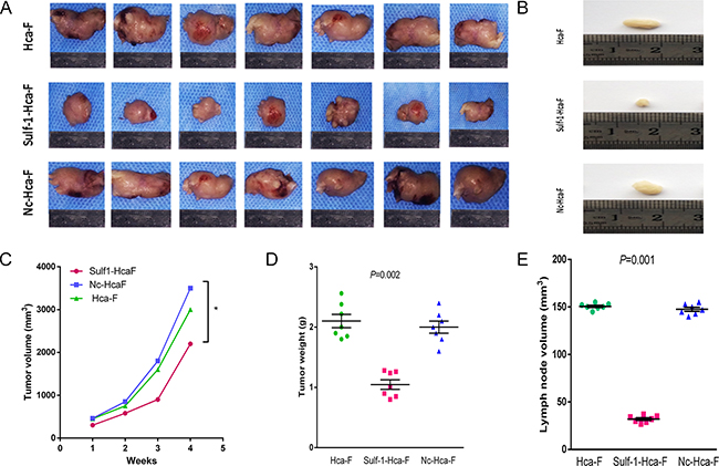 Note: LN refers to lymph node, LNM refers to lymph node metastasis. The difference of lymph node metastatic rate between Hca-F, Sulf-1-Hca-F and Nc-Hca-F groups were statistically significant at *