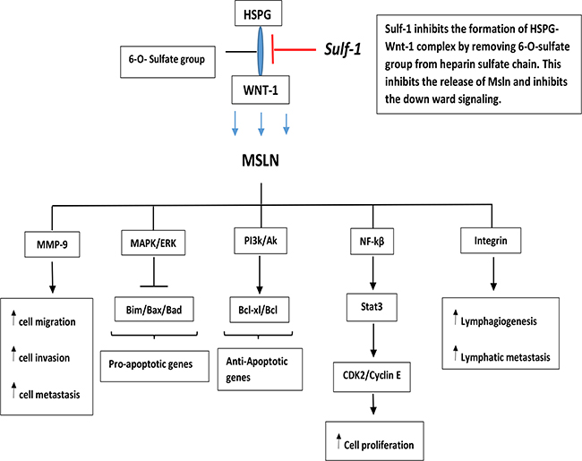 The expression of Msln was reported to be controlled by Wnt1/beta-catenin and in order for Wnt 1/beta-catenin to have high binding affinity to Msln, it needed to be attached to syndecan 1, which is an HSPGs with high sulfation status [12, 32]. Another study reported that, overexpression of Msln in breast cancer increased tumor cells lymph node infiltration, and decreased the overall survival rate of the cells by activating ERK1/2-MMP-9 signaling. The ERK1/2-MMP-9 signaling was found to be important in facilitating tumor cell invasion, migration and metastasis [33]. Knockdown of Msln was also reported to silence Wnt/beta-catenin signaling which played important role in Epithelial-Mesenchymal Transition (EMT), an important step in tumor metastasis process [34]. A study reported that luminal membrane expression of Msln both in gastric cancer and colorectal cancer correlated with the lymph node metastasis, blood vessels invasion, lymphatic invasion, recurrence and poor patient outcome [17, 31]. Our data showed that up-regulated Sulf-1 decreased Msln expression, and this could be attributable to the inhibitory effects of Sulf-1 on HSPGs that prevents the downstream intracellular signaling by Wnt, Figure 7.