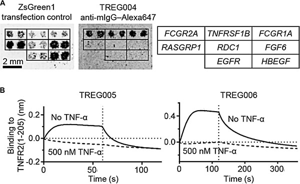 Figure 2: Treg-binding DARPins bind to TNFR2 in a TNF-α-competitive manner. (A) Binding of TREG DARPins to HEK293 cells expressing TNFRSF1B, FcγRs (positive controls) or other genes (negative controls) was investigated using membrane protein expression arrays. (B) Bio-layer interferometry was used to investigate the interaction of immobilised TREG005 and TREG006 with 100 nM soluble TNFR2(1-205) (solid lines) or 100 nM TNFR2(1-205) pre-incubated with 500 nM human TNF-α (dashed lines). Vertical dotted lines indicate transition from association to dissociation phases.
