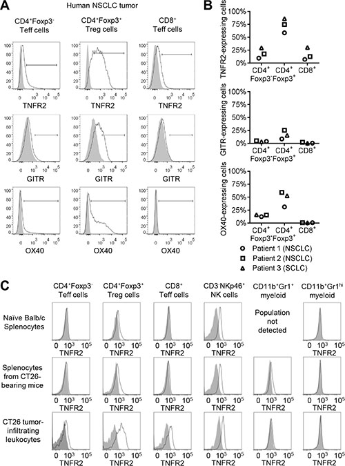 Figure 4: TNFR2 expression within tumors. (A) Tumor samples from three lung cancer patients were analysed for expression of TNFR2, glucocorticoid-induced TNF-related protein (GITR), OX40 and T cell lineage markers by flow cytometry. Data shown are for Patient 2 in panel (B). (B) Summary of TNFR2, GITR and OX40 expression for tumor-infiltrating T cells from three lung cancer patients. (C) Spleens and tumors from Balb/c mice implanted sub-cutaneously with CT26 tumor cells or spleens from untreated animals were analysed for expression of TNFR2 and lineage markers by flow cytometry (representative of eight tumor-bearing animals and three non-tumor-bearing animals in three independent experiments).