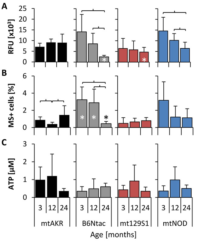 From 3 to 24 months, the reference strain mtAKR revealed constant levels of intracellular ROS (7.1 ± 1.7 x103 to 9.0 ± 4.0 x103 relative fluorescence units - RFU) and mitochondrial superoxide (0.9 ± 0.4 % to 1.5 ± 1.1 % of total nucleated cells -TNC). The B6Ntac strain displayed higher levels of total ROS and mitochondrial superoxide at 3 months (14.2 ± 8.1 x103 RFU; 3.2 ± 1.5 %) compared to 24 month old animals. However, at 24 months both parameters showed significantly lower levels than the reference strain (2.5 ± 0.7 x103 RFU; 0.5 ± 0.3 %). During aging ROS and mitochondrial superoxide production significantly decreased in B6Ntac. The mt129S1 strain exhibited a constant total ROS production during aging (6.4 ± 4.7 x103 to 4.7 ± 2.2 x103 RFU). Levels of total ROS (14.6 ± 6.4 x103 to 6.4 ± 2.9 x103 RFU) in BM cells of mtNOD mice decreased significantly during aging. ATP levels in all three strains did not change significantly during aging (Figure 1C).