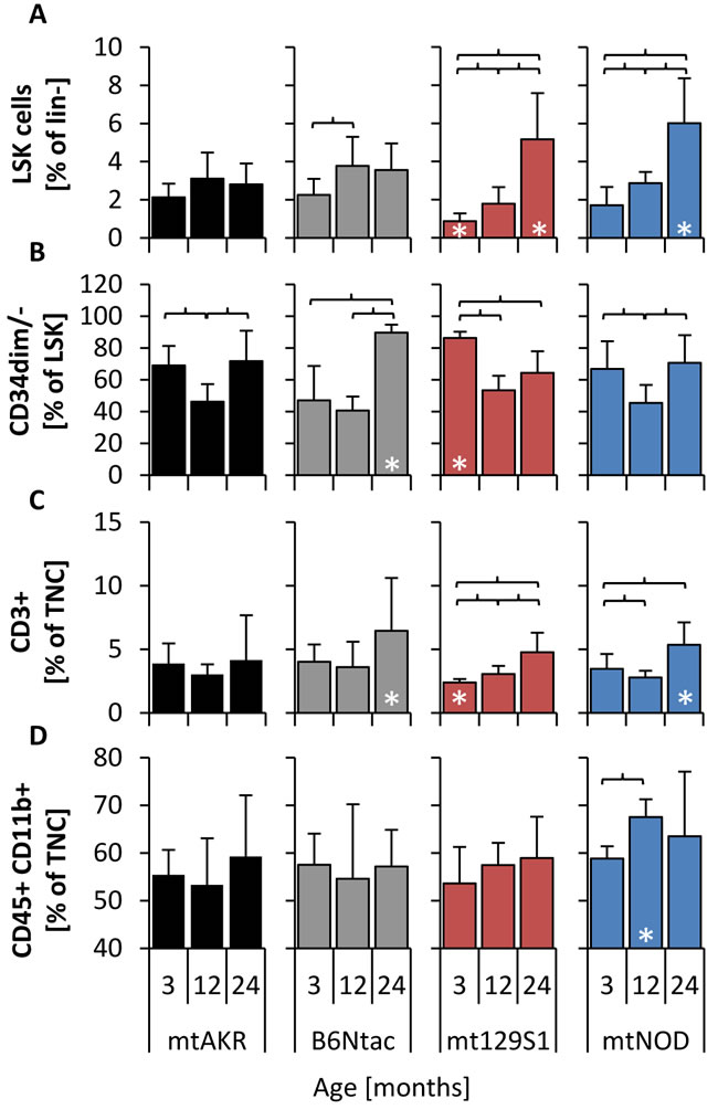 Figure 2: Polymorphisms in mtDNA impacted size of LSK pool and proportion of CD34dim/- cells. Analysis of subpopulations was carried out at three aging stages (3, 12 and 24 months) to investigate changes of bone marrow constitution during aging. LSK cells were analyzed by gating all cells negative for lineage specific antigens (lin-) and characterizing cells positive for Sca-1 and c-kit (Supplement 1) A. Long-term HSCs were investigated by determining LSK cells that are negative or weakly positive for CD34 B. T cells C. were characterized by antigen CD3 in TNC pool (total nucleated cells), while monocytes D. were identified by antigens CD45 and CD11b. The asterisk (*) marks significant differences (at a p-value threshold of <0.05) versus the mtAKR strain at the same aging stage. Brackets indicate significant changes within one strain during aging. Six or more mice were investigated for each strain and aging stage.