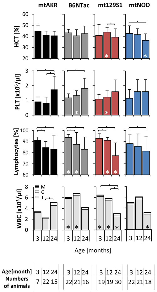 Figure 3: Polymorphism in mtDNA led to a reduced WBC in advanced-aged mice. Whole blood was investigated at three aging stages. The asterisk (*) marks significant differences (at a p-value threshold of <0.05) versus the mtAKR strain at the same aging stage. Brackets indicate significant changes within one strain during aging. Numbers of animals investigated at each time point are displayed at the bottom. Abbreviations: M = monocytes, L = lymphocytes, G = granulocytes.