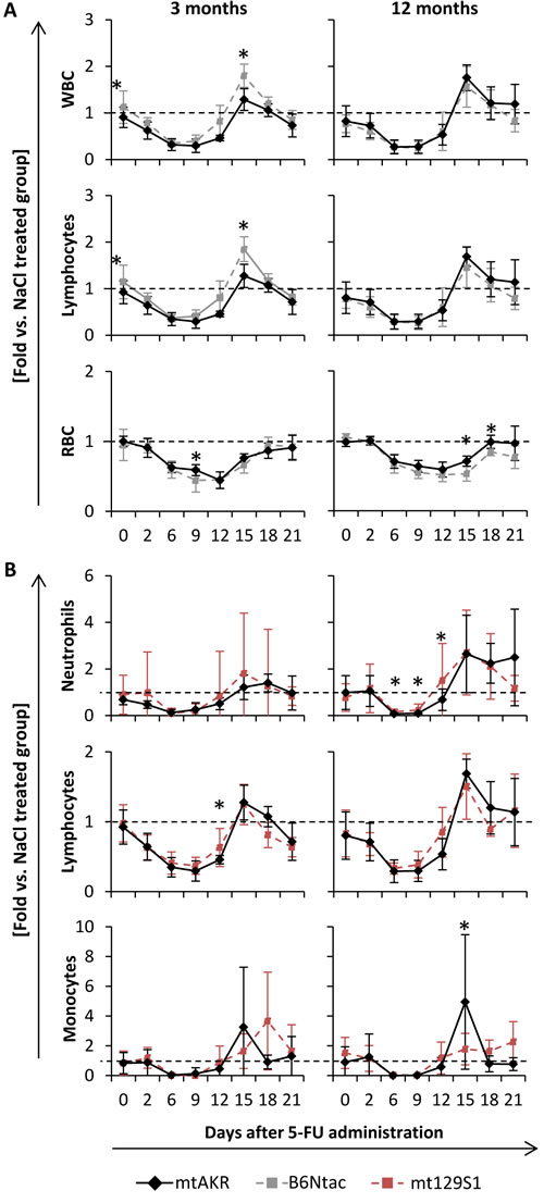 Moreover, 12 month-old mt129S1 mice displayed a higher nadir of neutrophils at day 6 and a faster regeneration at day 12 than mtAKR strain (Figure 4B). Additionally, the mt129S1 strain displayed a slower regeneration of monocytes at 3 and 12 months than mtAKR animals with significantly lower regeneration at day 15 and a delayed rebound maximum at day 21.