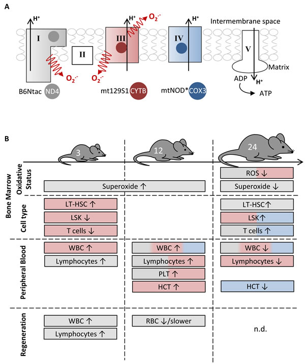 Figure 5: The impact of distinct mtDNA polymorphisms on hematopoiesis at different aging stages. A. The respiratory chain consists of five complexes. Of these, three (complexes I, III and IV) participate in the generation of the proton gradient across the inner membrane. The mtAKR mouse strain served as reference, because the analyzed strains B6Ntac (grey), mt129S1 (red) and mtNOD (blue) differ in a single polymorphism affecting one subunit of complex I, III and IV, respectively. *The mtNOD strain harbors an additional polymorphism in tRNA-Arg. B. The figure summarizes the main features of each strain in comparison to the reference mtAKR.