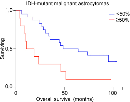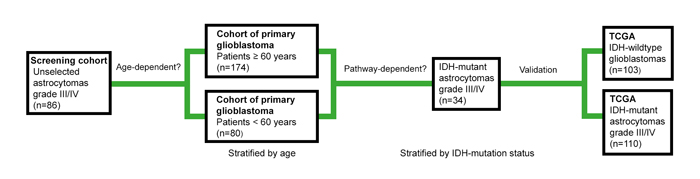 To represent the younger population of glioblastomas, we used a TMA from patients aged 18-60 years with high-grade gliomas enrolled in a treatment cohort with RT or RT and TMZ in various combinations. Inclusion criteria were histologically proven astrocytoma grade III or IV and age 18-60 years. A total of 145 patients were included between 2003-2008 and 110 tumor samples were available for construction of TMA and DNA extraction. Molecular characterization included analysis of 1p19q codeletion, MGMT promoter methylation status and IDH1/2 mutations. The present study describes the results for 80 patients with IDH-wildtype glioblastomas, and for 19 additional patients with IDH-mutant astrocytoma grade III or IV that were included in this TMA. Data collection included molecular tumor markers, histological diagnosis, age, treatment arm (RT versus RT plus TMZ), type of surgery, WHO performance status, steroids at baseline, and overall survival.