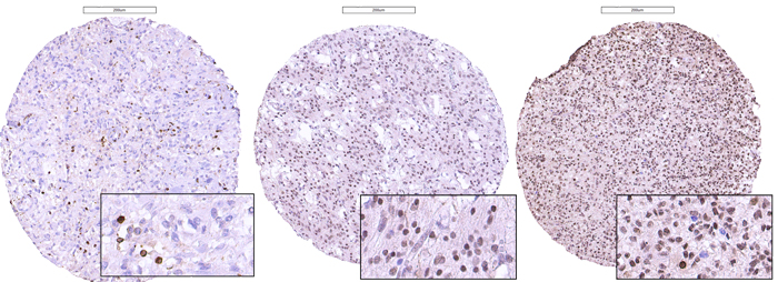 Figure 2: Photomicrographs of immunostaining with anti-PROX1 antibodies in glioblastomas, illustrating the scoring of the proportion of immunoreactive cells set as: ≤ 50% (left), 50-90% (middle) or ≥ 90% (right) of the total amount of tumor cells.