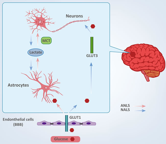 To date, there are two conflicting theories describing the cellular fate of glucose, and which propose different directions for lactate shuttling between neurons and astrocytes. These are termed the astrocyte-neuron lactate shuttle (ANLS) and the neuron-astrocyte lactate shuttle (NALS). The ANLS theory proposes that glucose is transported into astrocytes through the GLUT1 transporter and then metabolized to lactate [21, 22]. Lactate is transported to the outside of astrocytes and taken up by neurons and served as fuel through monocarboxylate transporters (MCTs) [23]. The NALS model predicts that neurons uptake glucose during activation and then transfer lactate to astrocytes [24]. Interestingly, if glucose and lactate are both present, neurons appear to have a preference for lactate [23]. Both neurons and astrocytes have strong demands for energy and are largely intolerant of inadequacy of energy supplies. Therefore, disruption of glucose shuttling and/or metabolism may result in various central nervous systemic pathologies [25, 26], and it may be important to rigorously define the relationship between glucose metabolism in brain cells and cerebral diseases.