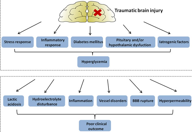 Hyperglycemia (both peak glucose and persistent hyperglycemia) is one of the most common secondary complications of severe TBI and is associated with poor clinical outcomes after this type of injury. In this review, we have summarized the mechanisms leading to hyperglycemia after TBI, including stress response, inflammatory response, diabetes mellitus, pituitary and/or hypothalamic dysfunction, surgery, and anaesthesia. TBI patients with hyperglycemia possess an increased risk of poor outcome and an increased mortality rate, which is more pronounced with persistent hyperglycemia (PH) than hyperglycemia on admission [49]. Some of the direct effects of hyperglycemia may be attributed to lactic acidosis, electrolyte disturbances, inflammation, vessel disorders, rupture of the BBB, and hyperpermeability. At present, the treatments of secondary brain injury with hyperglycemia may include nutritional support, glucose control, moderated hypothermia, naloxone, and mannitol. Although the relationship between hyperglycemia and severe TBI has made great progress in recent years, there are still many treatment limitations and gaps in our current knowledge.