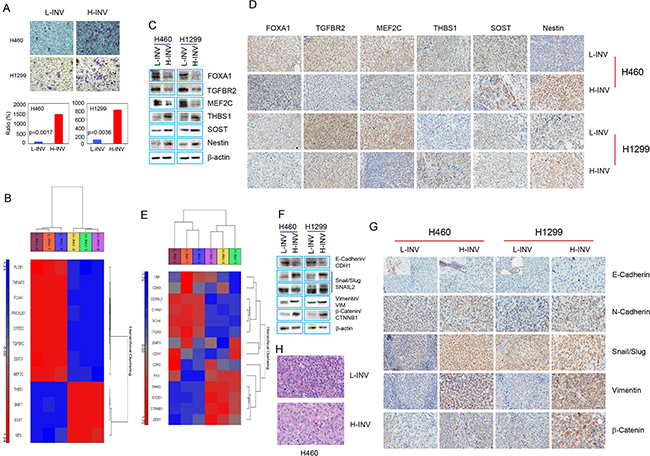 Figure 1: Differential expression of invasion-related genes and EMT regulators in H-INV and L-INV cells. A. Invasion assay showing the differential invasiveness. Top: representative images of transwell invasion. Bottom: ratios of cell invasiveness (normalized to the percentage of invaded L-INV cells). p values were determined from three independent experiments. Error bars indicate standard deviation; B. Functional clustering of invasion-related genes in H460 H-INV versus H460 L-INV cells; C. Western blots showing the basal protein levels of invasion-related genes in cells; D. Representative IHC images of invasion-related proteins in xenograft tumors. Small images insets depict positive staining of E-cadherin found in edges of tumor specimen; E. Functional clustering analysis of EMT regulatory genes in H460 H-INV versus H460 L-INV cells; F. Western blots showing the basal protein levels of EMT regulators in cells. b-actin was included as loading control; G. Representative IHC images of EMT regulatory proteins in xenograft tumors; H. Representative images of H.E staining for xenograft tumors derived from H460 L-INV and H460 H-INV cells.