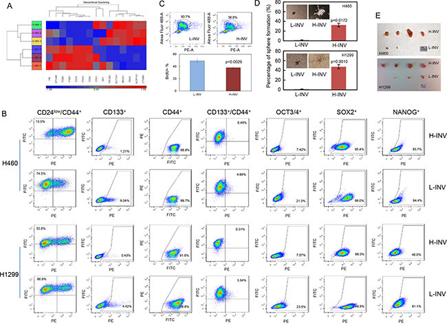 Figure 2: Enrichment of CSCs in H-INV cells. A. Functional clustering of putative stem cell marker genes in H460 H-INV versus H460 L-INV cells; B. Flow cytometry analyses for putative CSCs markers; C. Graphs showing the difference of sphere numbers counted in sphere formation assay. The figure insets depict representative spheres; D. Tumorigenicity. Images showing the collected tumors from tumor initiating test; E. BrdU incorporation assay in H460 H-INV and H460 L-INV cells. Numbers indicate the percentage of BrdU-positive cells. p values were determined from three independent experiments. Error bar indicates standard deviation.