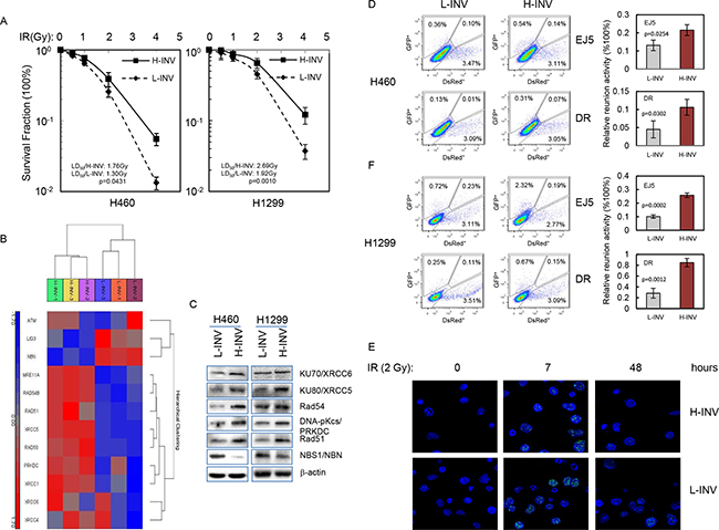 Figure 3: Resistance of H-INV cells to radiation treatment. A. Clonogenic survival analysis showing the resistance of H-INV cells to IR treatment; B. Functional clustering of DNA damage repair genes in H460 H-INV versus H460 L-INV cells; C. Western blots showing the basal protein levels of DNA damage repair genes in cells. b-actin was included as loading control; D. in vivo reunion assays. Left: representative result of reunion analysis; right: Graphs showing the changes of relative HDR and NHEJ activity; E. Representative images of nuclear γ-H2A.X foci in irradiated H460 H-INV and H460 L-INV cells. Average LD50 and p values were determined from at least three independent experiments. Error bars indicate standard deviation.