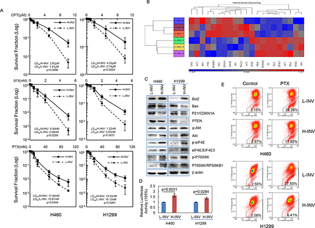 Figure 4: Resistance of H-INV cells to chemotherapeutic agents. A. Clonogenic survival analyses showing the resistance of H-INV cells to treatment of chemotherapeutic agents; B. Functional clustering of cell survival-related genes in H460 H-INV versus H460 L-INV cells; C. Western blots showing the basal levels of protein and protein phosphorylation of survival-related genes in cells. b-actin was included as loading control; D. Relative NFkB activity; E. Mitochondrial apoptosis measured in cells treated with paclitaxel (PTX). Average LD50 and p values were determined from at least three independent experiments. Error bars indicate standard deviation.
