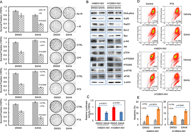 We further evaluated the potential effects of SAHA on the sensitivity of H460 H-INV cells to treatments of IR or chemotherapeutic agents, and the results showed that pretreatment with SAHA significantly reduced clonogenic survival of H460 H-INV cells in response to Cisplatin (2 μM), Paclitaxel (10 nM), Docetaxel (0.5 nM) or IR (2 Gy) (Figure 6A). SAHA treatment also caused obvious changes of protein expression for cell survival-related genes in H-INV cells of H460 and H1299 cell lines. These changes included down-regulation of Rad51, Ku80 and Bcl-2, and upregulation of Bax and PTEN in H-INV cells for both H460 and H1299 cell lines. Although SAHA treatment only slightly reduced Akt protein level in H460 H-INV cells and P70S6K protein level in H1299 H-INV cells, and showed no effects on expression of elF4E protein in both H460 H-INV and H1299 H-INV cells, we observed significant decreases in the phosphorylation levels of Akt, P70S6K and elF4E in SAHA-treated H-INV cells for both H460 and H1299 cell lines (Figure 6B). SAHA treatment also decreased the basal level of NFkB activity in H-INV cells (Figure 6C). These results indicated that exposure to SAHA could reduce cell survival capability, which was further supported by our findings that SAHA treatment led to increased apoptotic responses when cells were treated with Paclitaxel (Figure 6D and 6E).