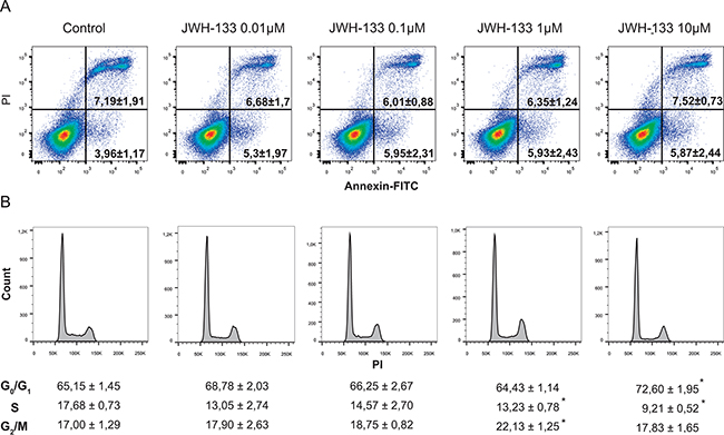 Figure 2: A. Evaluation of apoptosis by Annexin V-FITC/IP staining. Representative plots of Annexin V-FITC/IP staining of HT29 cells cultured in the presence of increasing concentrations of JWH-133 for 48h, including the percentage of early apoptotic cells (bottom right quadrant) and late apoptotic cells (upper right quadrant). B. Cells were incubated in the presence of increasing concentrations of JWH-133 for 48h and cell cycle was assayed by flow cytometry. Data are the means ± s.e. of three different experiments. *p < 0.05 using Student’s t-test for the comparison between vehicle-treated and cannabinoid-treated cells.