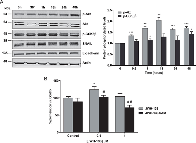 Figure 3: Signaling mechanisms activated by JWH-133 0.1 μM in HT29 cells. A. Cells were incubated for different times with 0.1 μM of JWH-133 in serum-free medium. The phosphorylation of AKT and GSK3β, and SNAIL and E-cadherin levels were analyzed in the cells by western blot (WB) analysis using the indicated specific antibodies. Representative blots of three different analyses are shown (left). Densitometric analysis of AKT and GSK3β phosphorylation levels was performed with ImageJ (NIH) software and data are represented as the means ± s.e. of three different experiments. *p < 0.05, **p < 0.01 and ***p < 0.001 using Student’s t-test for the comparison between vehicle-treated and cannabinoid-treated cells (right). B. HT29 cells were incubated with 0.1 or 1 μM JWH-133 for 48h in the presence or absence of 0.5 μM AKT inhibitor, iAKT 1/2 (iAkt) and cell viability was assayed with CCK-8. Control JWH-133 group, DMSO; Control in JWH-133+iAkt, 0.5 μM iAkt. Data are the means ± s.e. of three different experiments, each performed with six replicates. *p < 0.05 using Student’s t-test for the comparison between vehicle-treated and cannabinoid-treated cells; and #p < 0.05 and ##p < 0.01 for the comparison between cannabinoid-treated and iAkt-treated cells.
