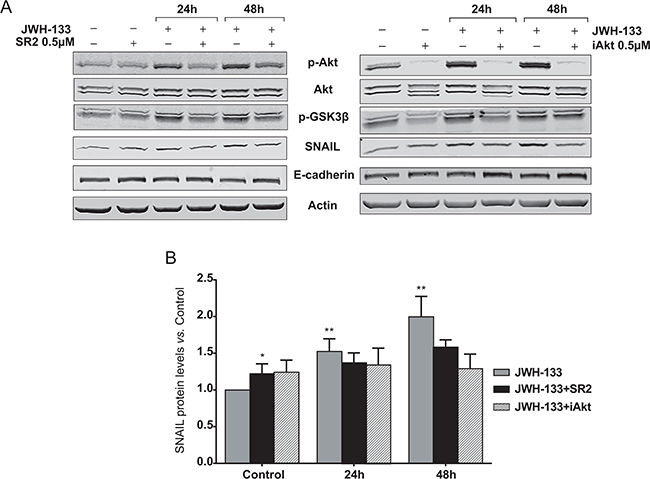 Figure 4: Inhibition of AKT/PKB and GSK3β phosphorylation, and SNAIL stabilization by the CB2 antagonist, SR2; and the AKT inhibitor, iAkt. A. HT29 cells were pre-incubated with 0.5 μM SR2 (left panel) or 5 μM iAkt (right panel) for 5h prior to be incubated for 24h and 48h with JWH-133 0.1 μM in presence or absence of 0.5 μM SR2 or 0.5 μM iAkt. Representative blots of three different analyses are shown. B. Densitometric analysis of SNAIL was performed with ImageJ (NIH) software and data are represented as the means ± s.e. of three different experiments. *p < 0.05 and **p < 0.01 using Student’s t-test for the comparison between vehicle-treated and cannabinoid-treated cells.